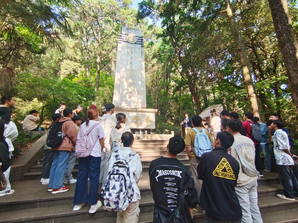 清风拂山岗,党心映朝阳。活动当日,学生党员们从茶马花街出发,沿西山古道徒步前行。山路蜿蜒,党员们相互鼓励,在行进中感悟革命先辈筚路蓝缕的奋斗精神。抵达南洋华侨机工抗日纪念碑后,全体肃立默哀,向在滇缅公路运输抗战物资中牺牲的华侨机工致敬。在纪念碑前,杨滇同志通过翔实的史料与文物,生动讲述了南洋华侨机工“赤子功勋”的感人事迹,带领青年党员重温了“抗战输血管”滇缅公路上的热血传奇。