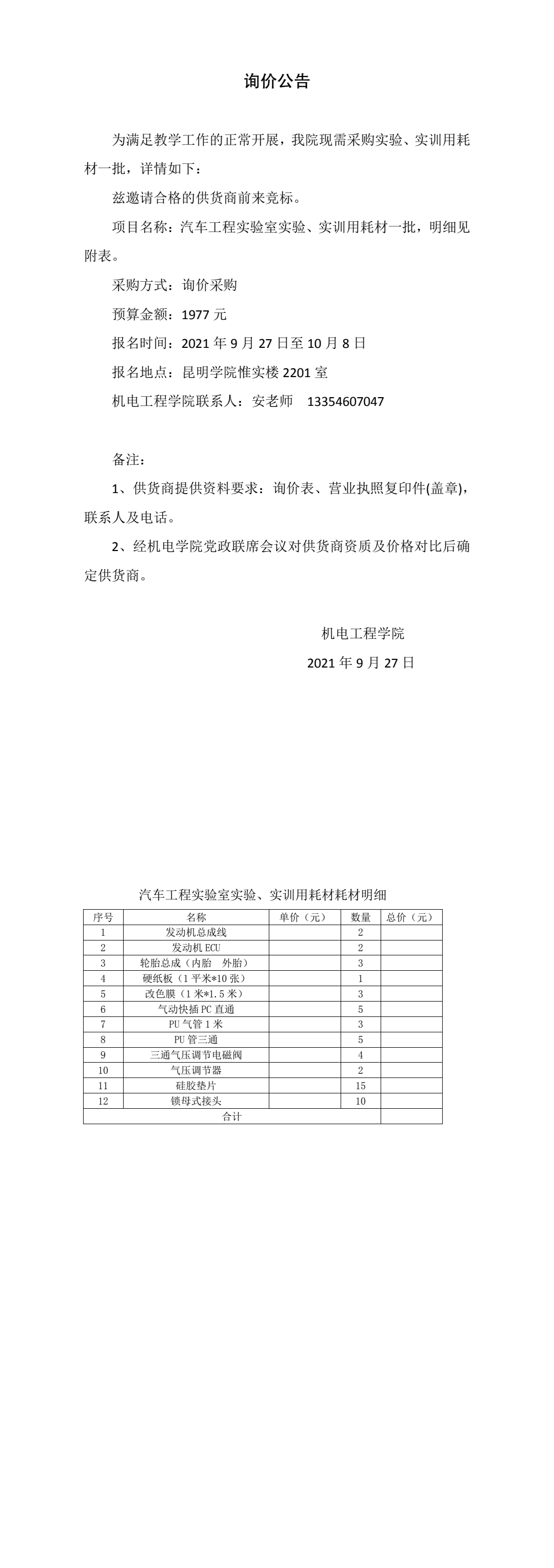 昆明学院机电工程学院关于“电气教研室课程设计耗材项目”采购的询价结果公示