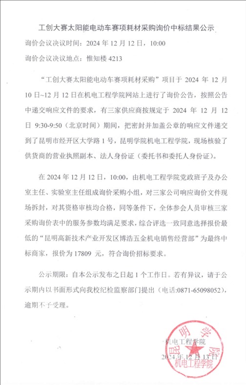 工创大赛太阳能电动车赛项耗材采购询价中标结果公示