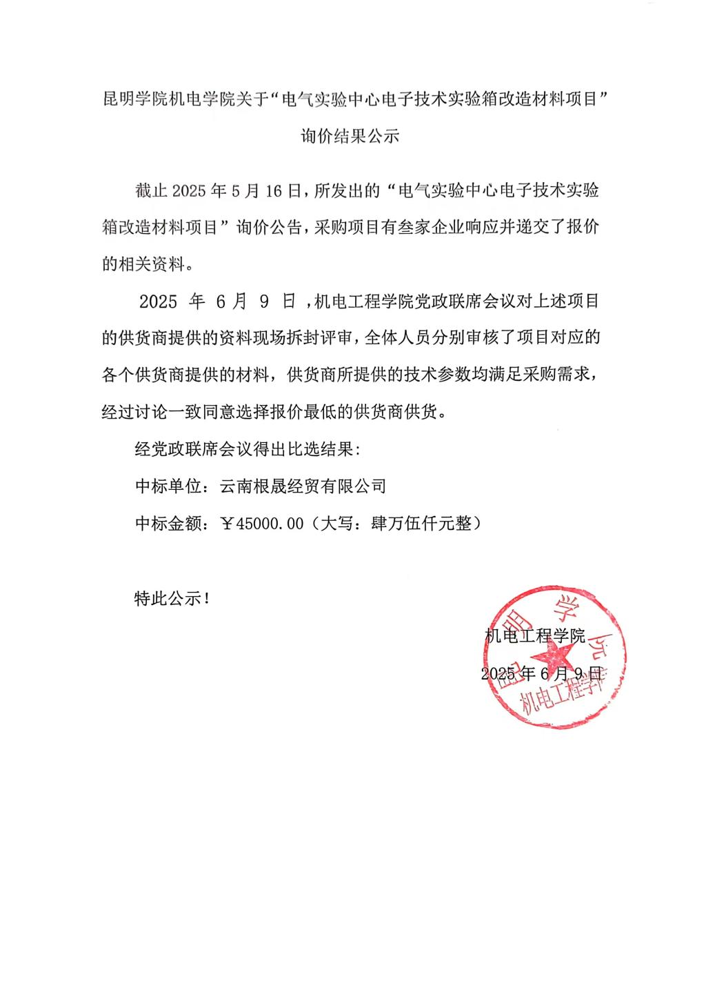 机电学院关于电气实验中心电子技术实验箱改造材料项目询价结果公示
