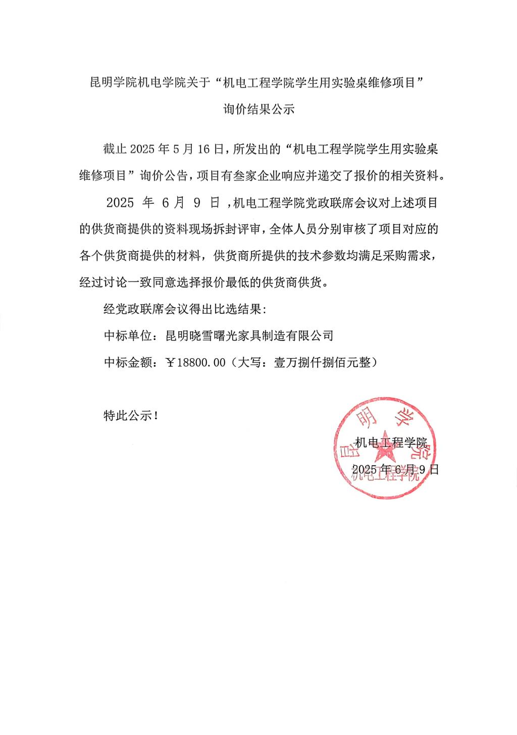 机电学院关于机电工程学院学生用实验桌维修项目询价结果公示