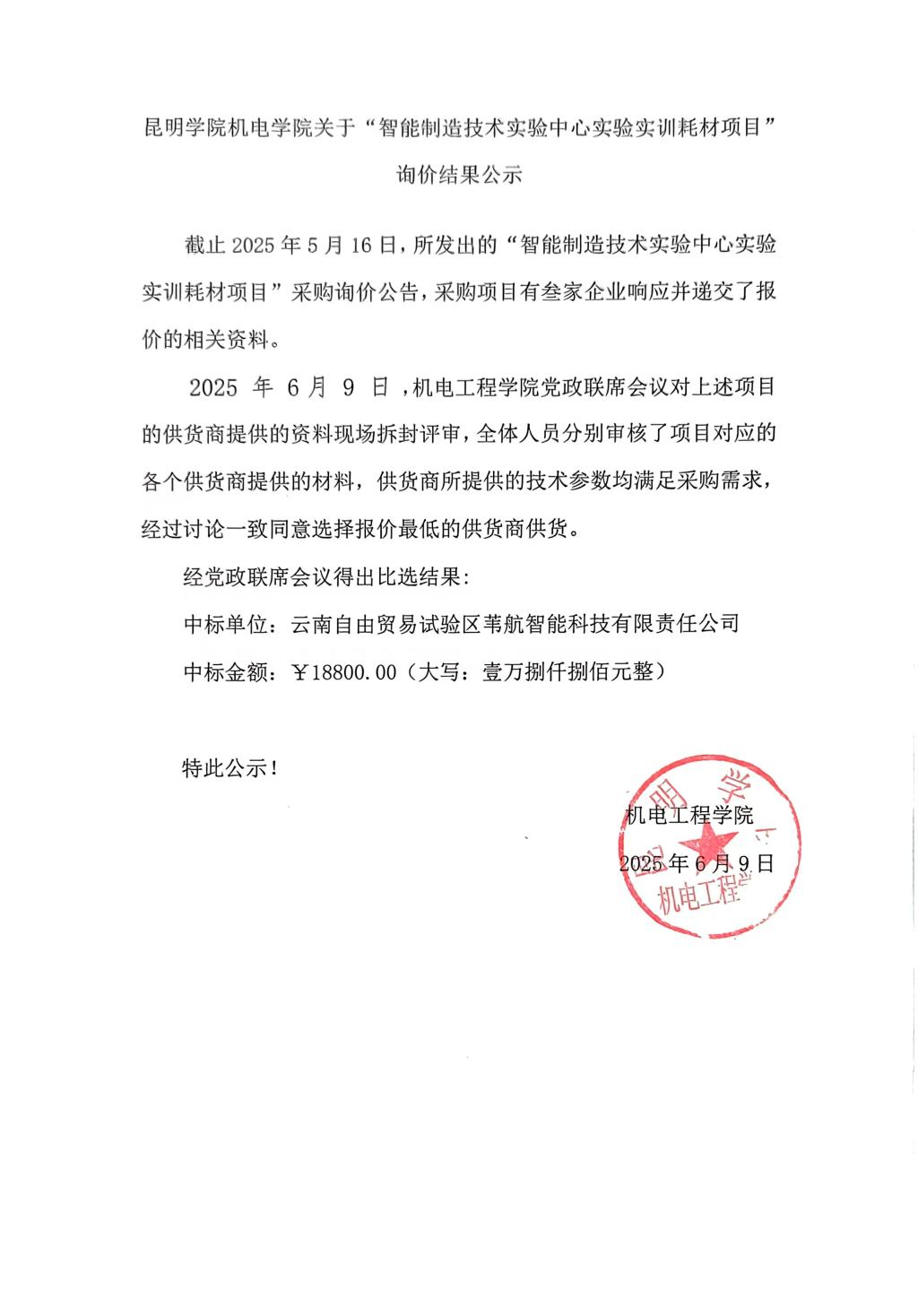 机电学院关于智能制造技术实验中心课程设计实训耗材采购项目询价结果公示