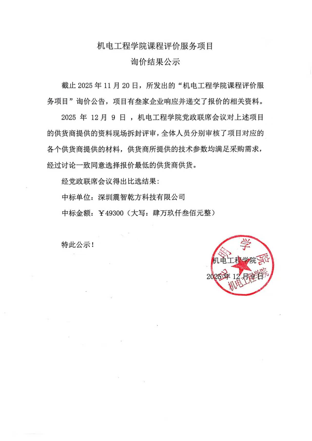 机电工程学院课程评价服务项目 询价结果公式